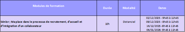 - Restitution des travaux d'intersession : Présentation des stratégies des binômes et échanges collectifs. •Le sénior et le recrutement : Comment collaborer efficacement avec les RH et les managers? Exercice pratique : analyse et optimisation de ma propre fiche de poste.