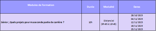 Ce module de formation collective vise à aider les seniors à identifier et valoriser leurs compétences, à comprendre les opportunités professionnelles qui s'offrent à eux, et à élaborer un plan d'action pour la seconde partie de leur carrière. La formation se déroule en distanciel et comprend des séances interactives, des ateliers pratiques et des travaux de réflexion en intersession.